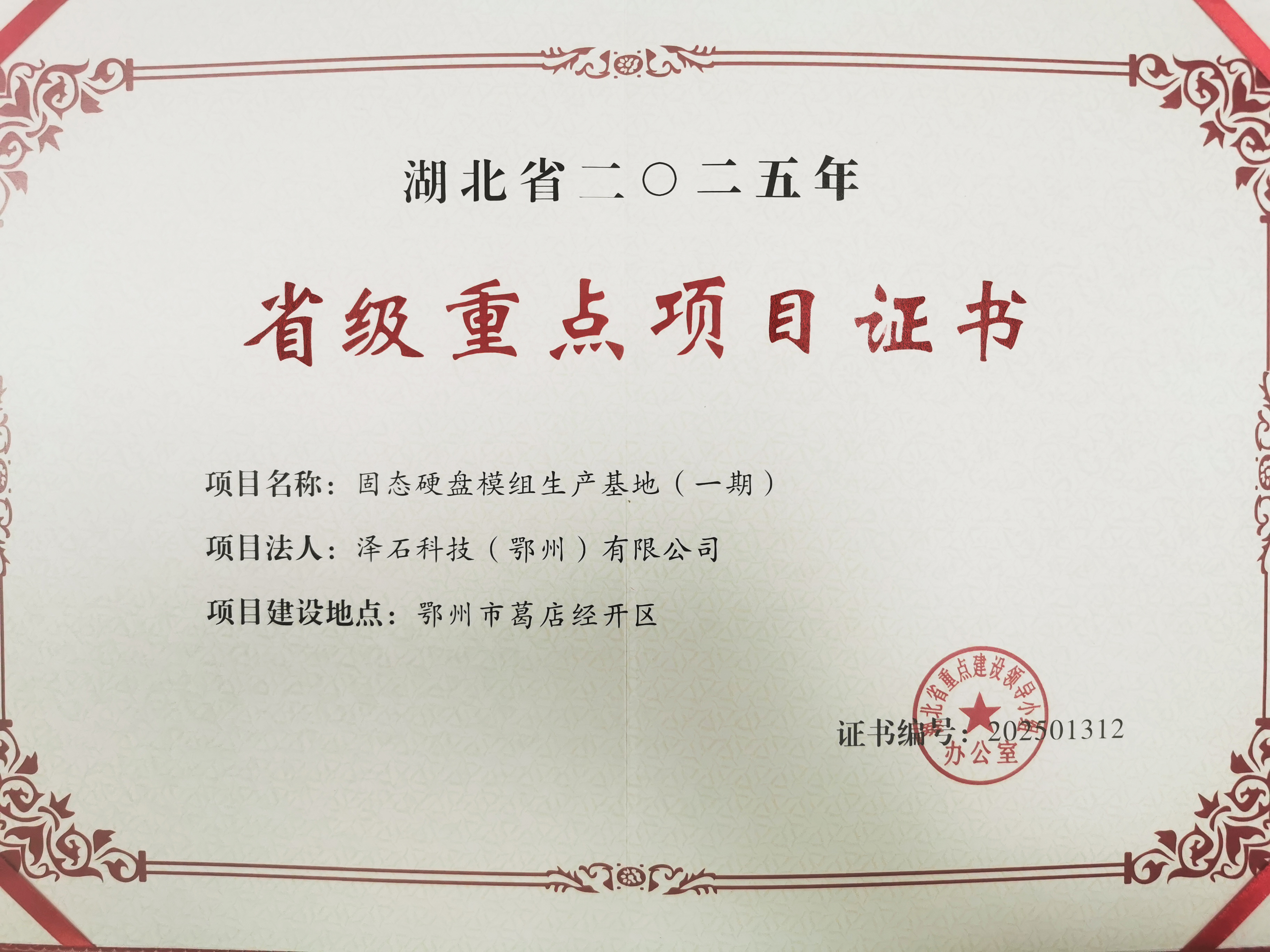 近日,泽石科技位于湖北省鄂州市葛店经济技术开发区的固态硬盘模组生产基地(一期)正式获评2025年湖北省省级重点项目。