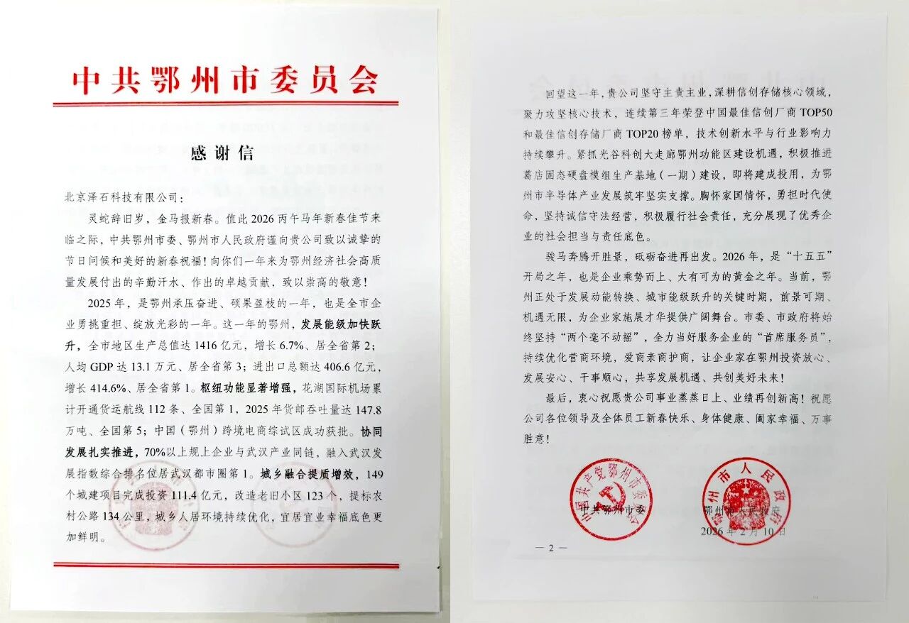2026 年新春伊始,北京泽石科技有限公司收到中共鄂州市委、鄂州市人民政府的感谢信,信中对泽石科技过去一年深耕国产化存储领域,积极推进葛店固态硬盘模组生产基地(一期)建设,即将建成投用,助力鄂州半导体产业发展做出的卓越贡献给予高度肯定。